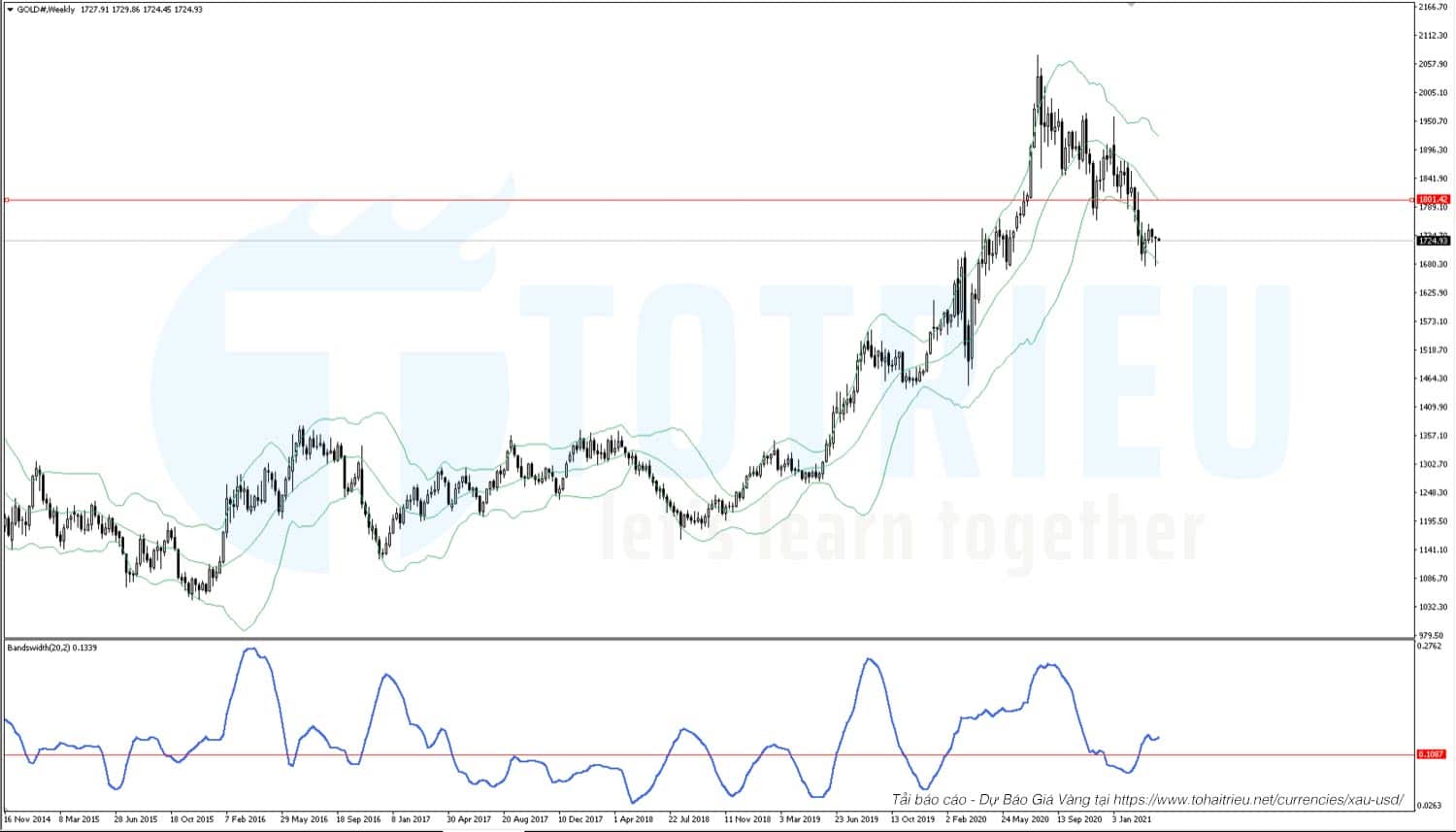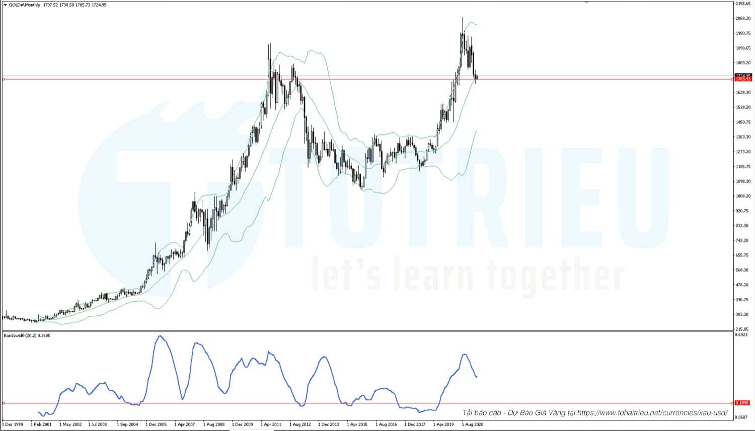 Có hai điểm mà Tôi chú ý khi quan sát Bollinger Bands trên biểu đồ hàng tháng của Giá Vàng trong quý 2 năm 2021: