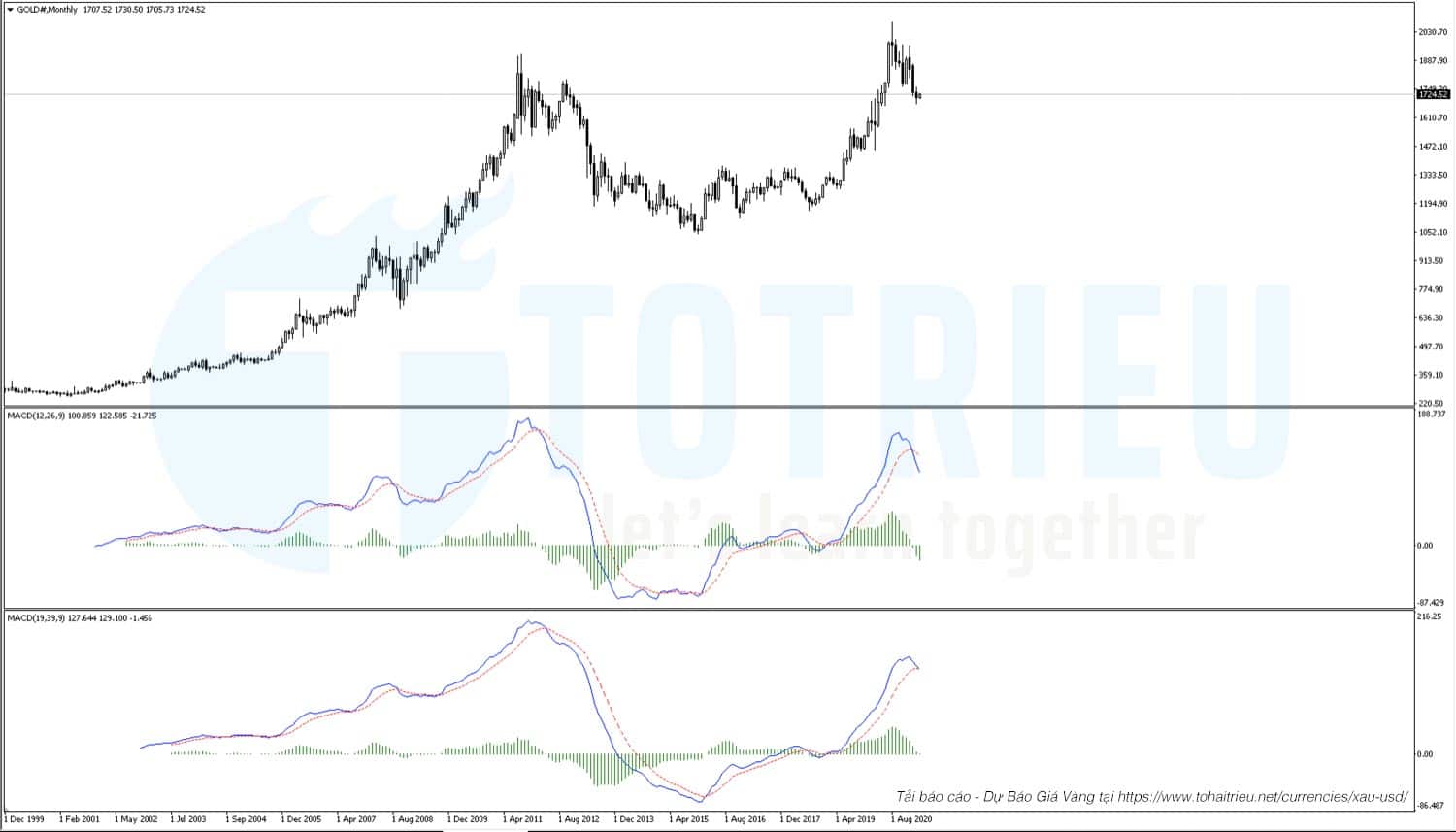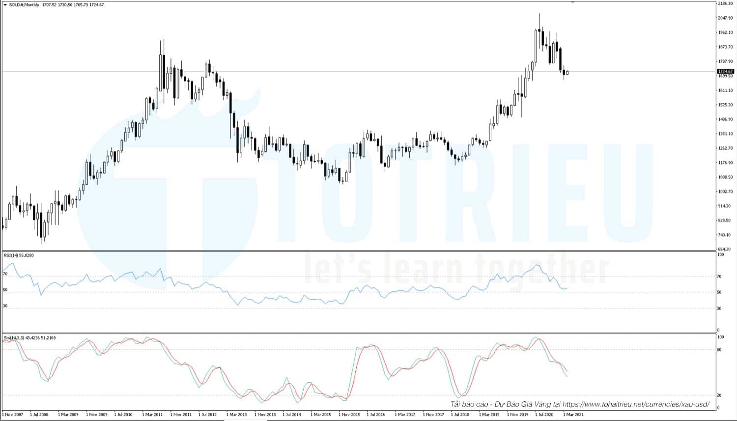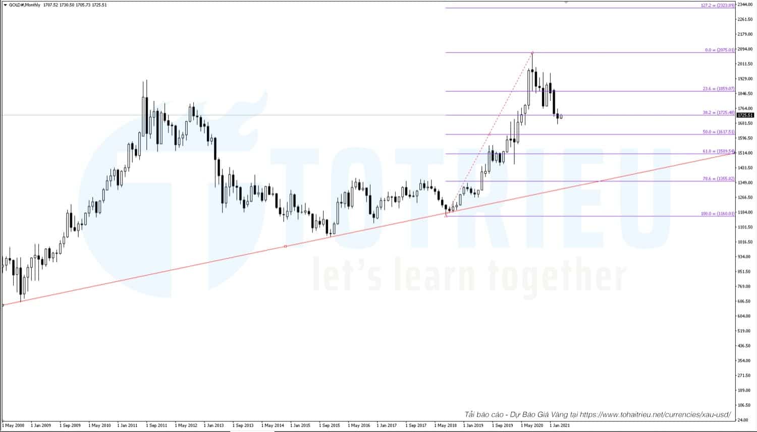 Xu hướng chủ đạo trên biểu đồ hàng tháng của giá vàng vẫn là xu hướng tăng. Hiện tại, vàng đang có dấu hiệu hướng về đường xu hướng tăng trong dài hạn được duy trì từ tháng 04-2006.