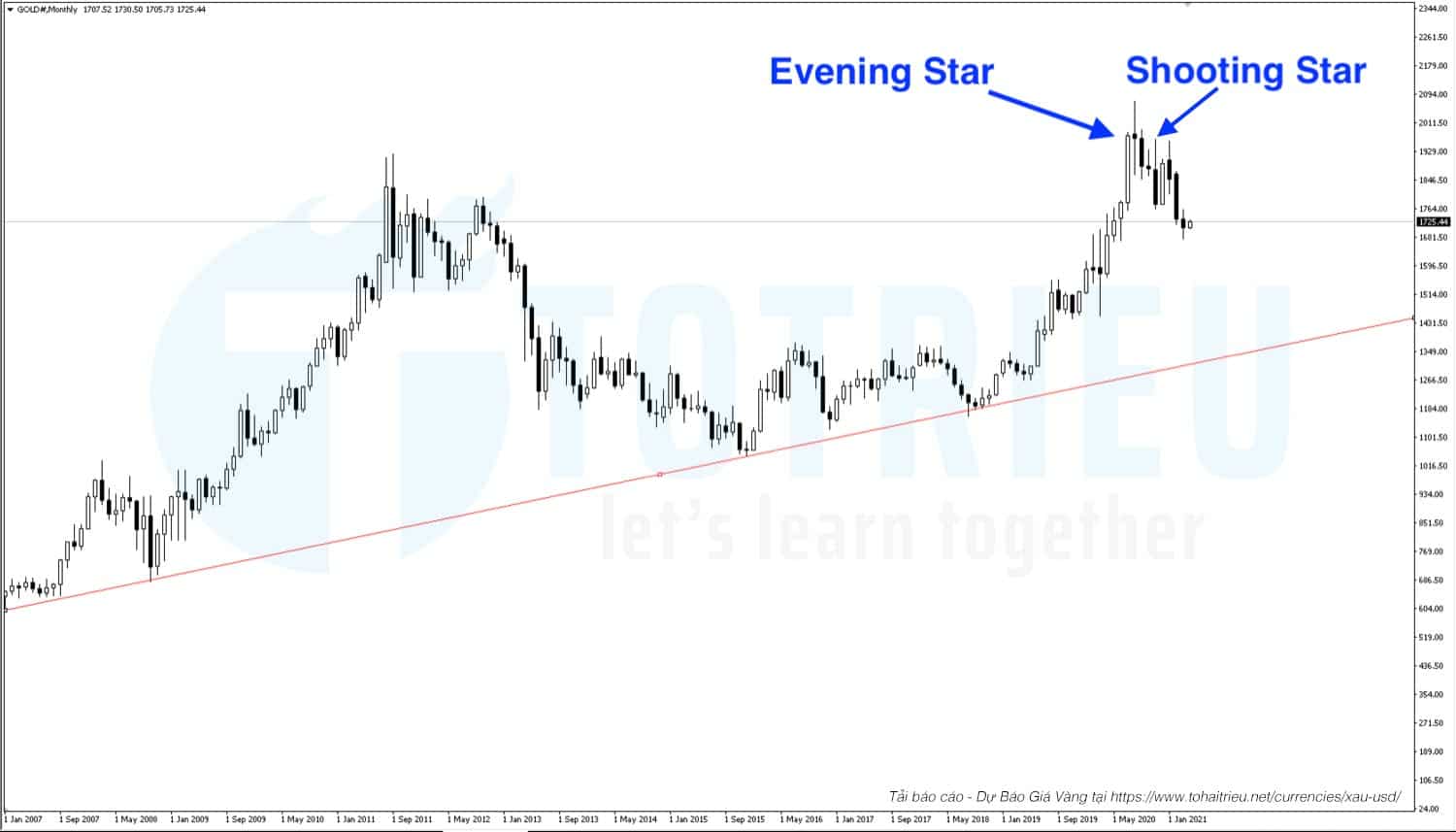 Biểu đồ tháng của Giá Vàng năm 2021 xuất hiện cụm Evening Star, Tỷ giá đã liên tục quay về kiểm tra lại vùng giá đóng cửa của nến thứ 3 trong cụm mô hình và đang tiếp tục sụt giảm.