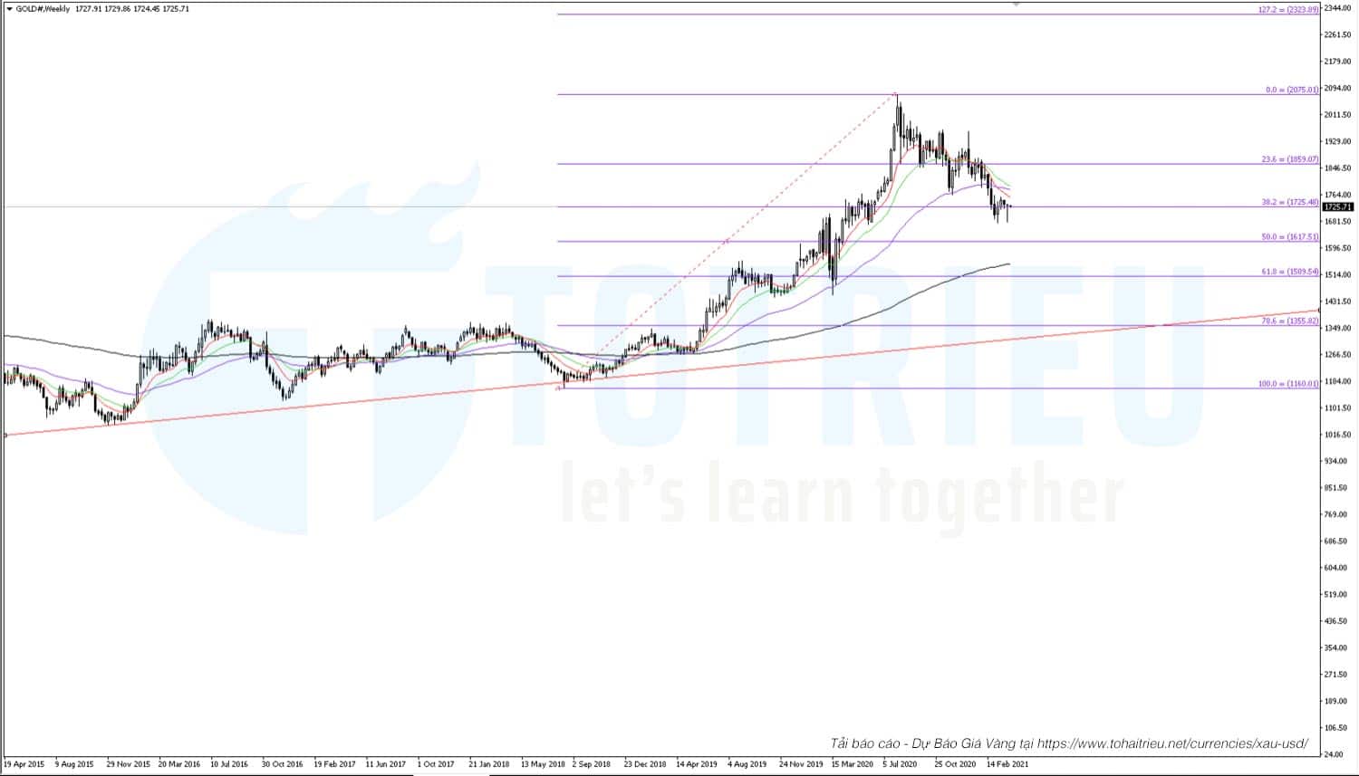 Hiện tại, Giá Vàng quý 2 năm 2021 đang biến động ở vùng Fibo Retracement 38.2% – $1725.40/oz.