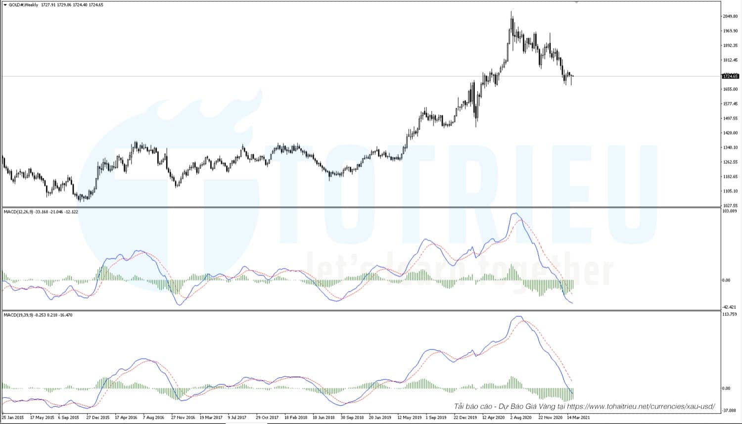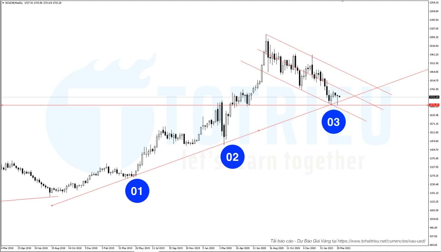 Xu hướng của giá vàng biểu đồ tuần quý 2 năm 2021 là xu hướng tăng chủ đạo.