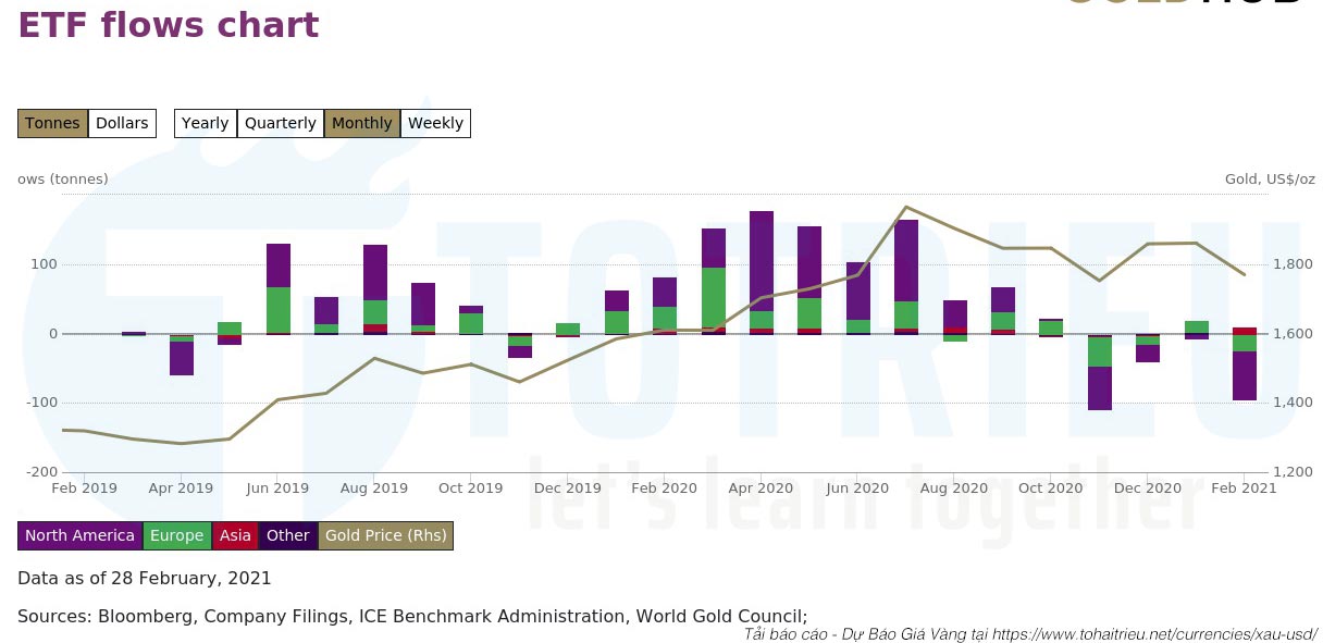 - WisdomTree Physical Gold bán ra -2.7 tấn – 2.1%