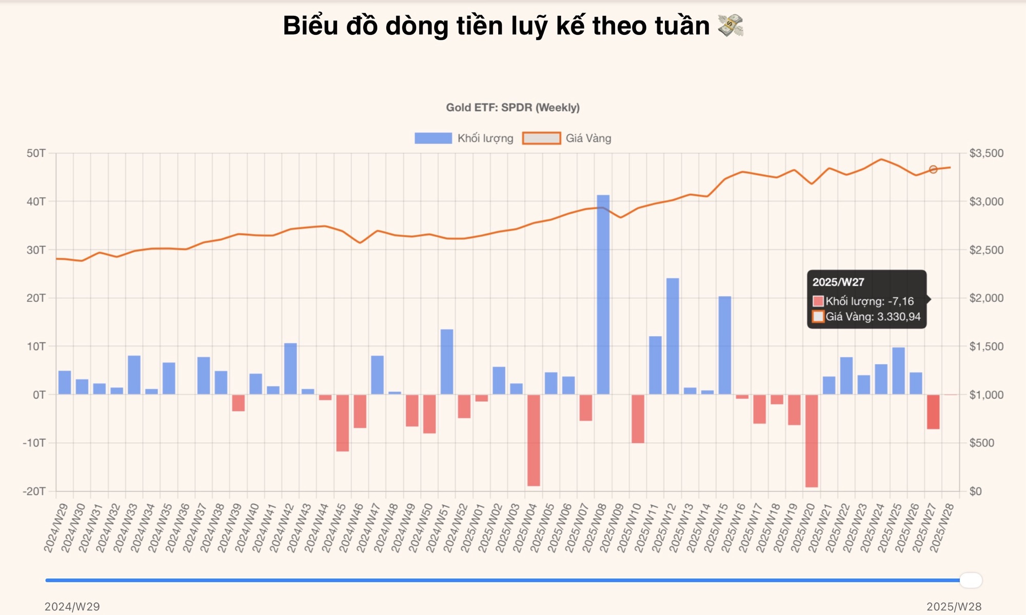 Dòng tiền vào quỹ SPDR đột ngột chững lại sau 6 tuần vào ròng liên tiếp. Điều này có lẽ do ảnh hưởng bởi việc các loại tài sản rủi ro tăng mạnh. Tuần 27/2025, SPDR bán ra 7,16 tấn vàng, tương ứng với mức rút ròng khoảng 766.3 triệu USD từ quỹ này. Tuần 28 mức độ giảm bớt và gần như cân đối, chỉ âm nhẹ 0.02 tấn khi Gold phục hồi sức mạnh.