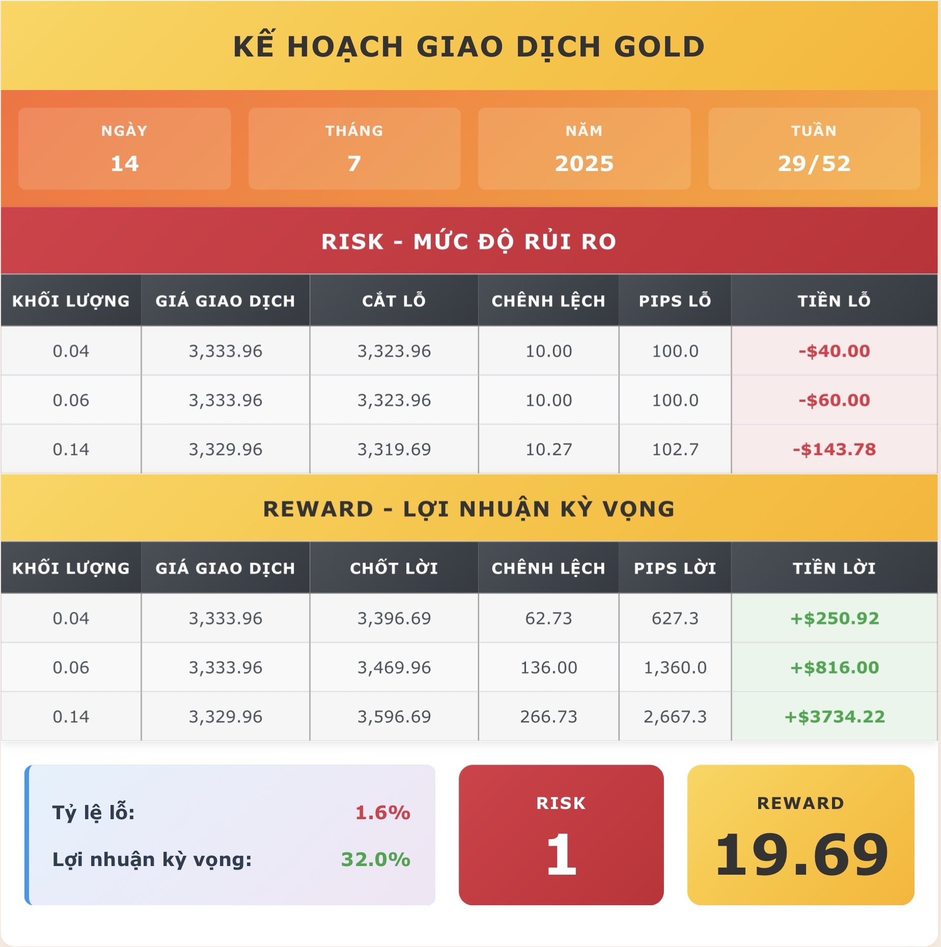 Với những số liệu và nhận định phía trên, Tuần 29/2025 Tôi dự kiến sẽ chờ một pha Pullback về vùng giá 3332 – 3325 để đánh lên với mục tiêu 3400, 3469 và 3596: