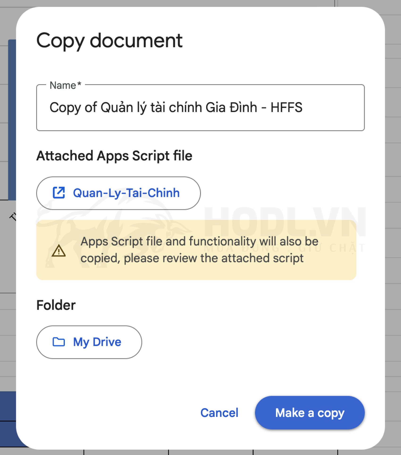 Mỗi tháng, vào File, chọn Make a copy. Đặt tên "HFFS Backup - Tháng chấm Năm". Phòng trường hợp nhập liệu sai hoặc lỗi kỹ thuật.