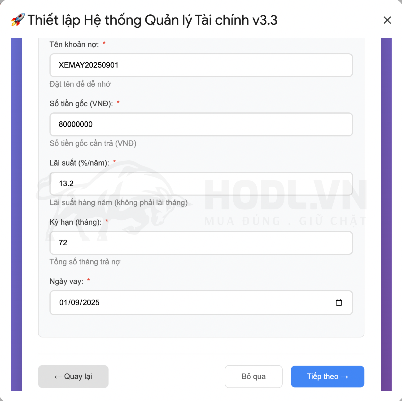 Nếu bạn có nhiều khoản nợ, trong Thiết lập chỉ khai báo 1 khoản chính. Sau khi setup xong, bạn có thể thêm các khoản khác từ Menu Quản lý tài chính → Nhập liệu → Quản lý nợ
