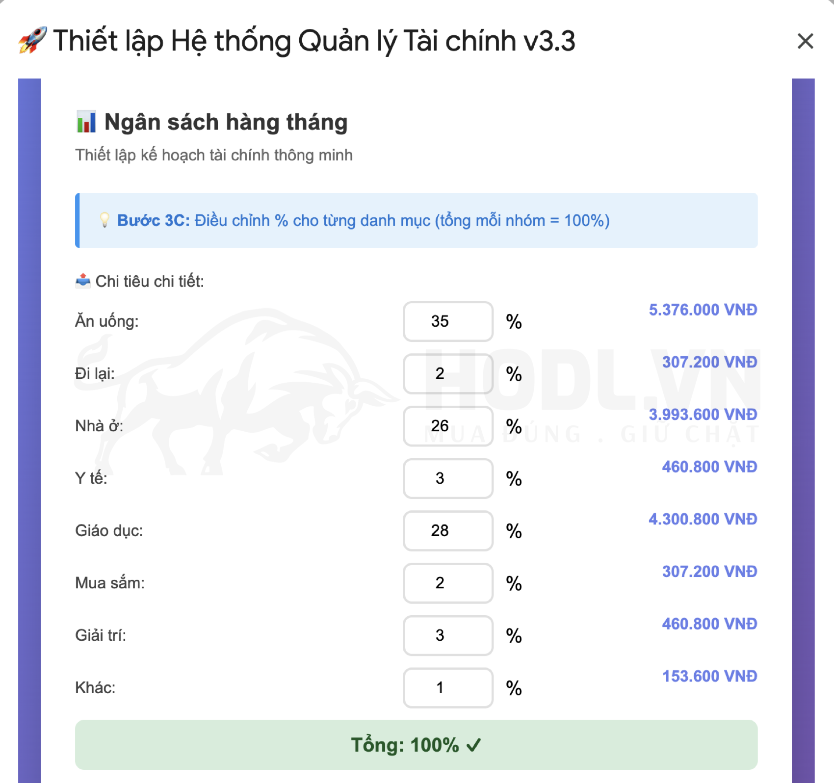 Cộng tổng 100% chi tiêu được tính dựa theo tổng số tiền chi tiêu thiết lập ở bước trước đó. Ví dụ: Thu nhập 24 triệu và chi tiêu 50% thì khi cộng tổng 100% trong thiết lập chi tiêu sẽ = 24 x 0,5 - 12 triệu.