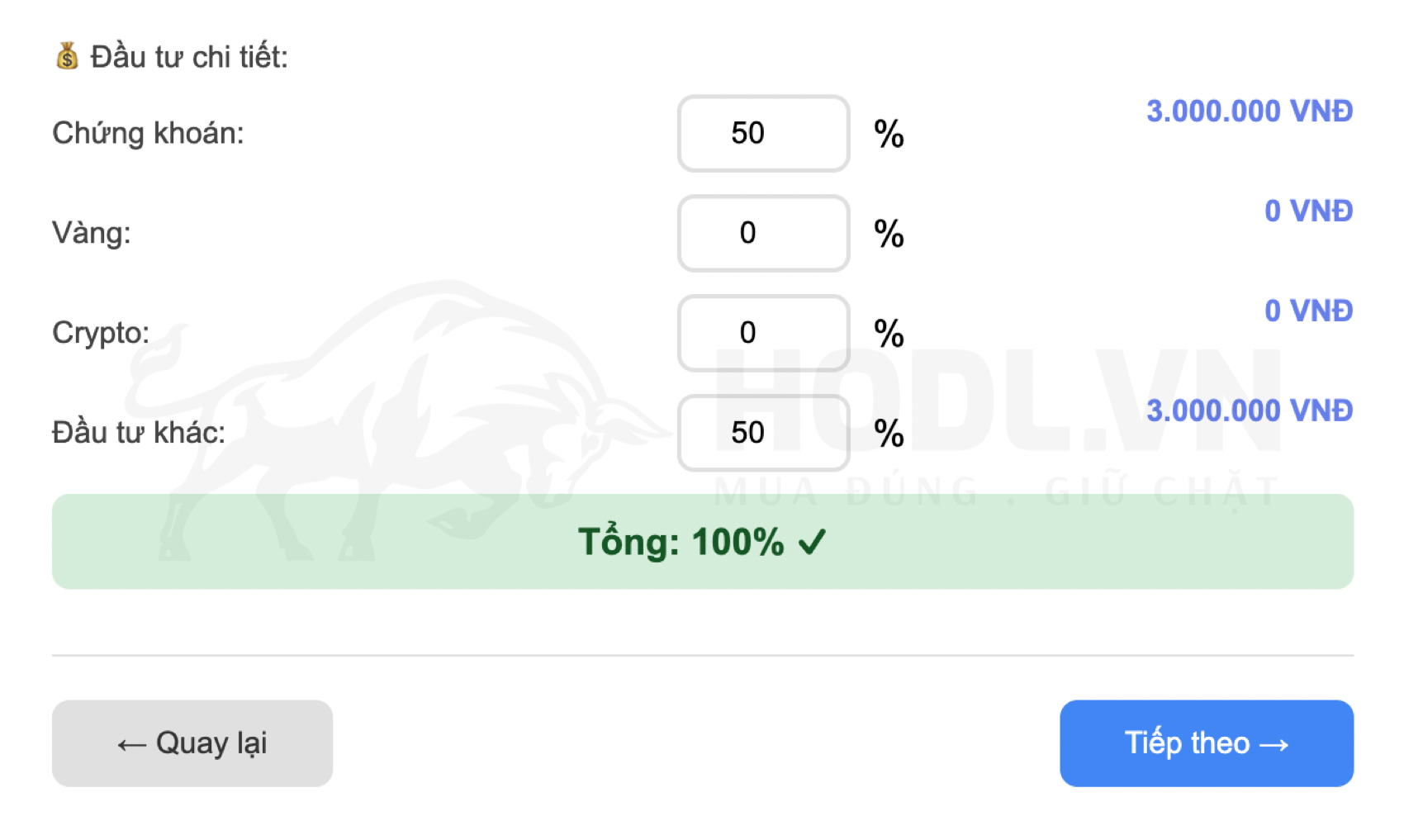 Nếu chọn Chứng khoán là 50%, Đầu tư khác 50% thì mỗi mục được phân bổ 3,6 triệu.