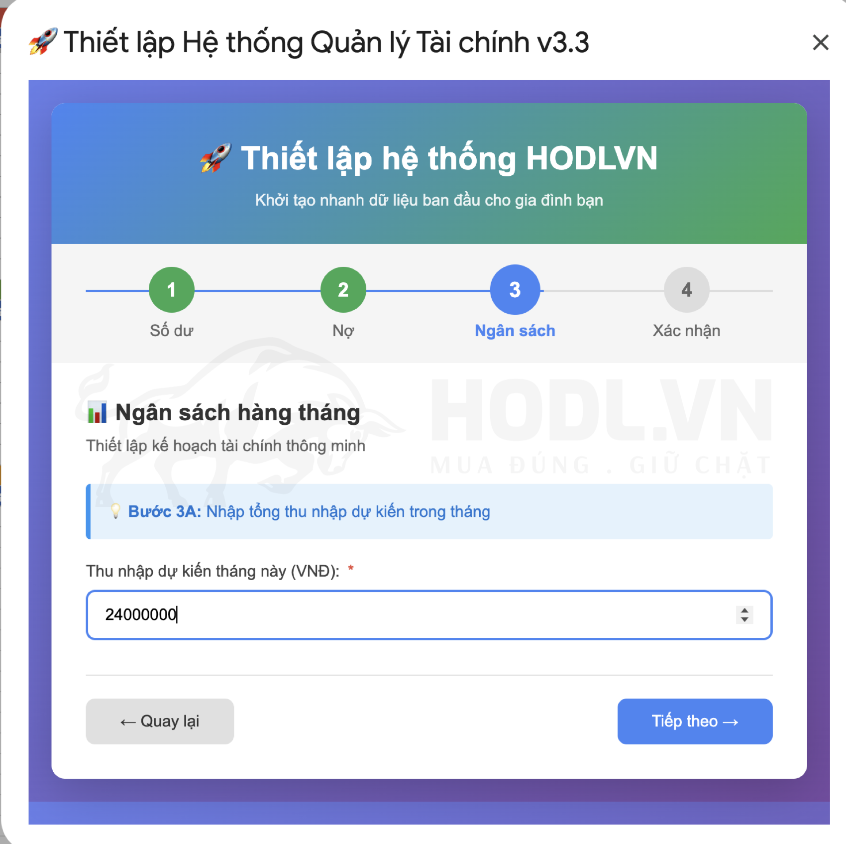 Trình thiết lập sẽ hiện ra với 4 bước: Số dư, Nợ, Ngân sách, Xác nhận.