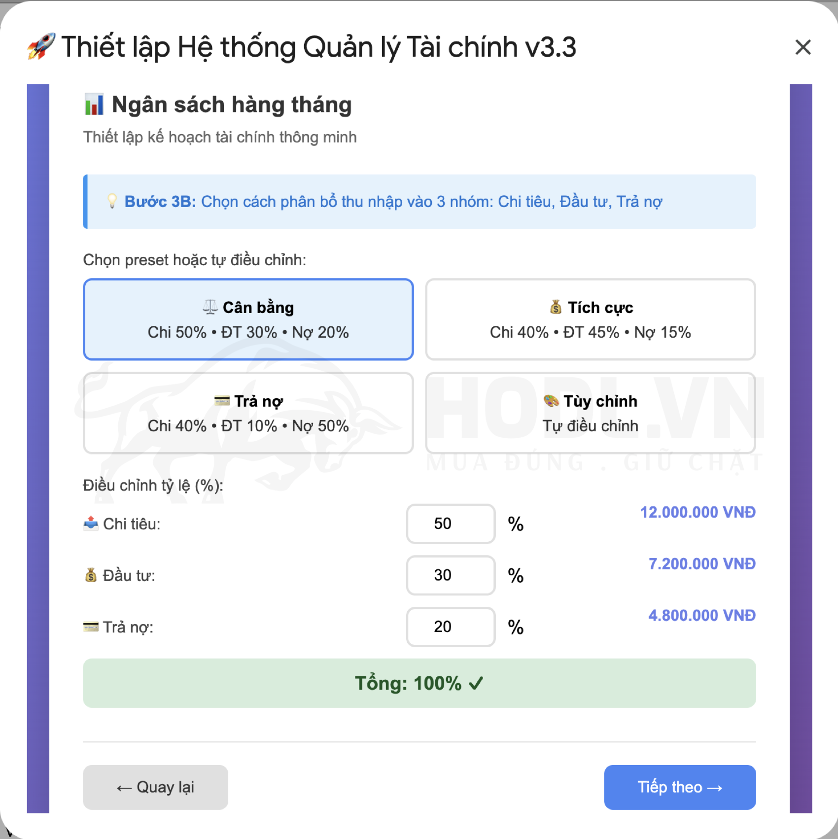 Sau khi chọn preset, wizard cho phép bạn tùy chỉnh % cho từng nhóm chi tiêu.