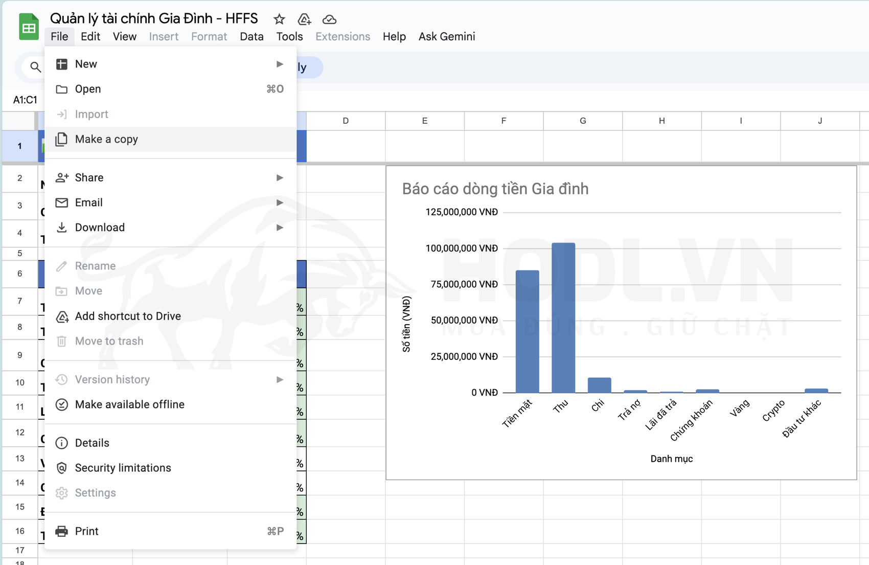 Chị Dậu làm theo hướng dẫn: click File → Make a copy → Đặt tên "Tài chính gia đình Dậu 2025 - HFFS" → Make a copy. 5 giây sau, sheet mới hiện ra.