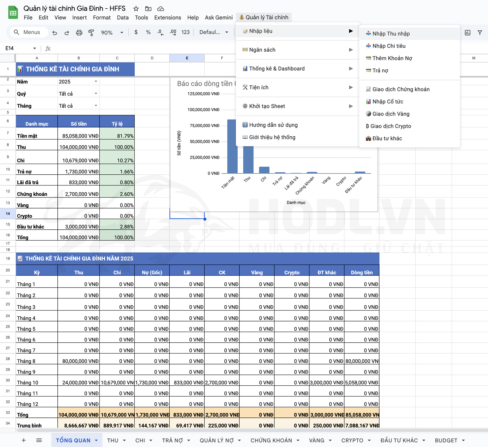 Hệ thống Quản lý Tài chính Gia đình toàn diện - HODLVN Family Finance System - viết tắt là HFFS - chính là câu trả lời. HFFS là một hệ thống quản lý tài chính gia đình được xây dựng trên nền tảng Google Sheets kết hợp với Google Apps Script, phát triển bởi HODL.VN.