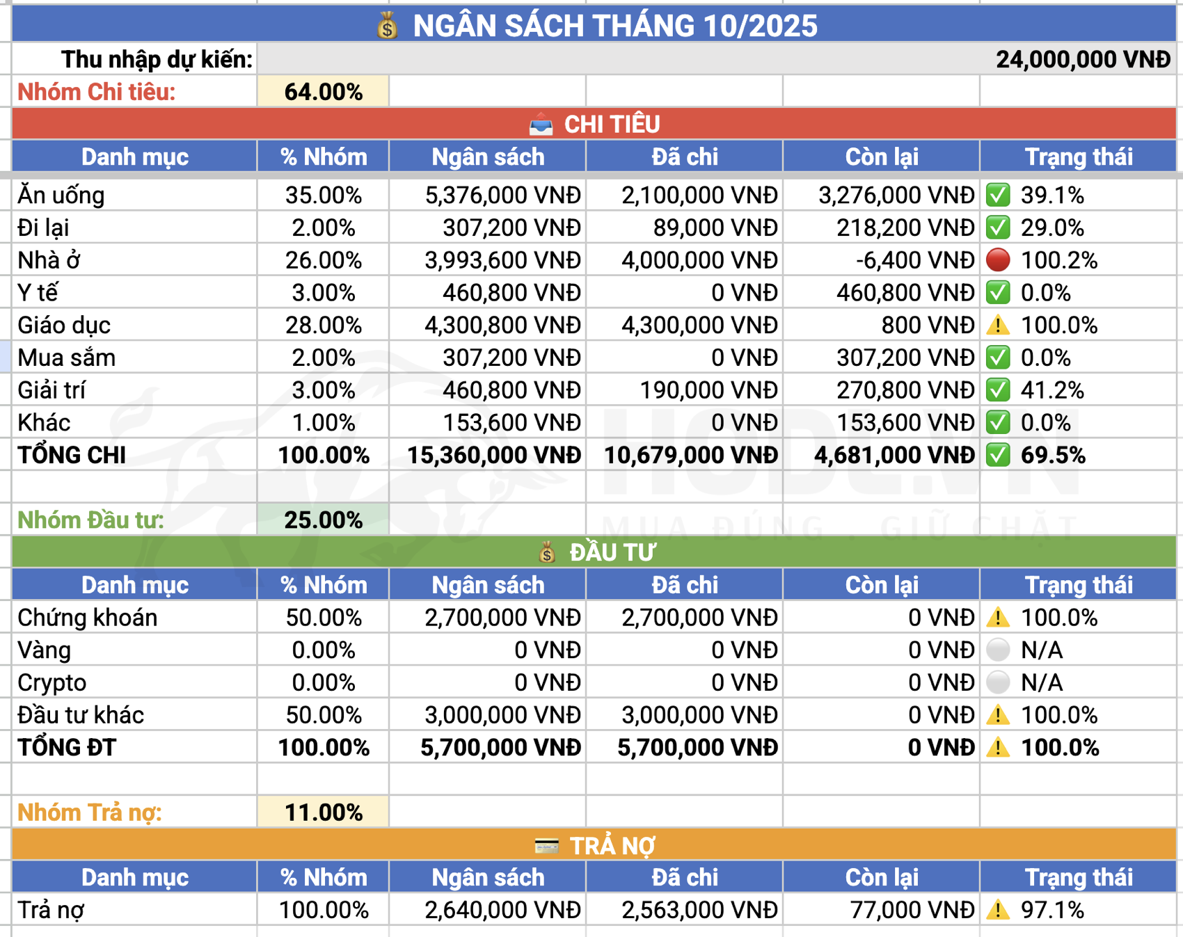 | Danh mục | Ngân sách | Đã chi | Còn lại | Trạng thái |