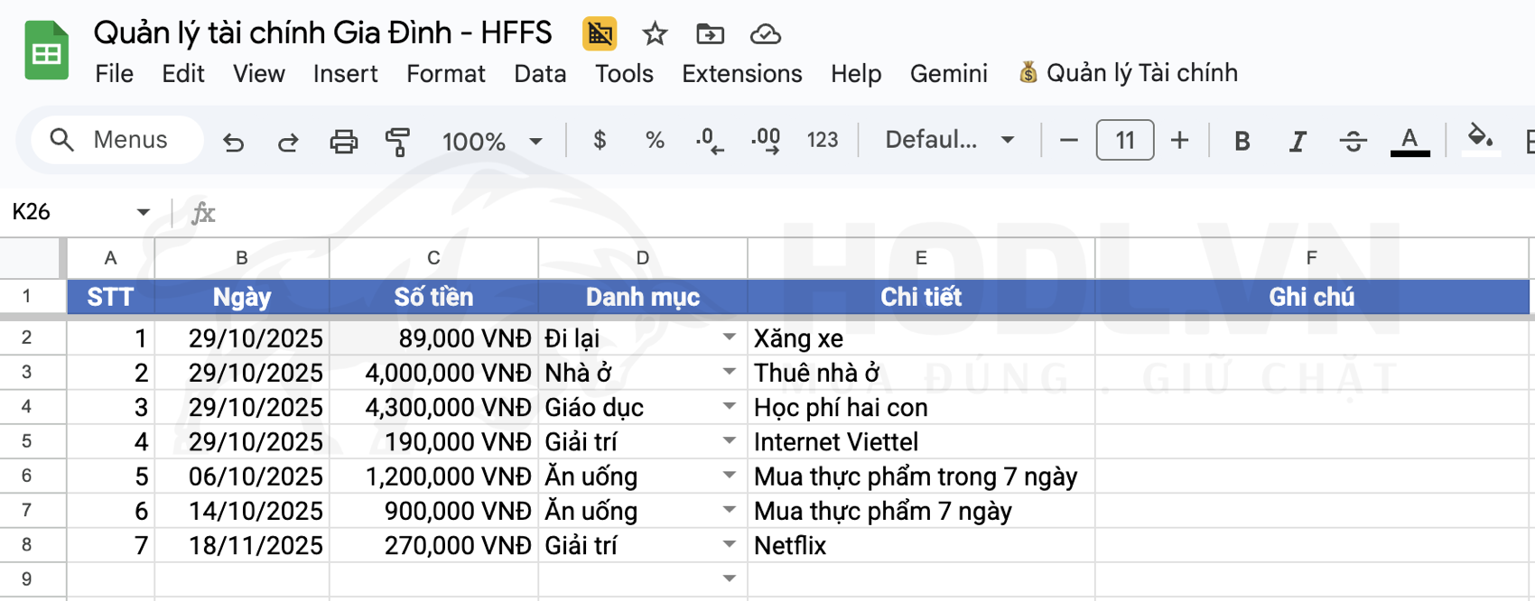 Ghi sai danh mục? Vào Sheet "Chi tiết Khoản chi", tìm dòng đó và sửa lại trong vài giây.