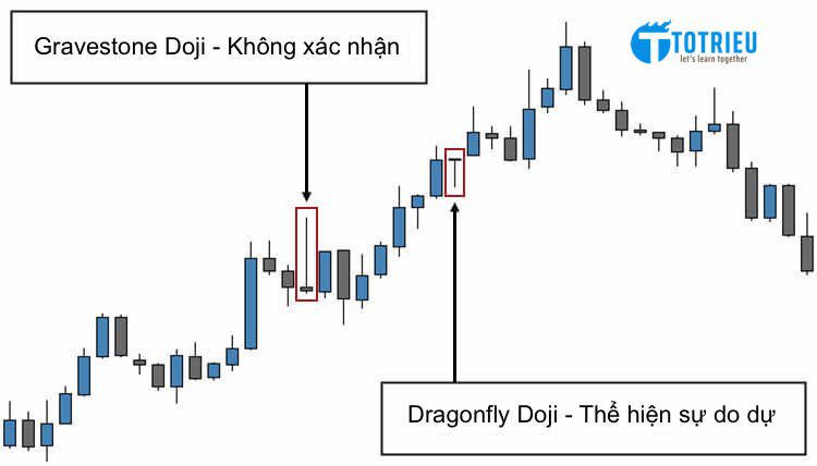 Hình ảnh dưới đây sẽ giúp bạn hiểu lý do tại sao cần chờ nến xác nhận mô hình. Bởi như đã nói phía trên Dragonfly Doji và Gravestone Doji thể hiện sự do dự của thị trường khi giá mở cửa và giá đóng cửa của nến gần như cùng một điểm.