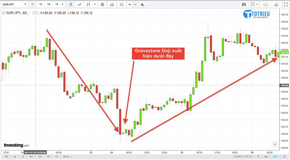 Trường hợp 02: Khi Gravestone Doji xuất hiện dưới đáy trong xu hướng giảm giá, Gravestone Doji là phiên bản lỗi của Mô hình Búa ngược. Nó cũng mang tính chất do dự, thiếu quyết đoán của thị trường.