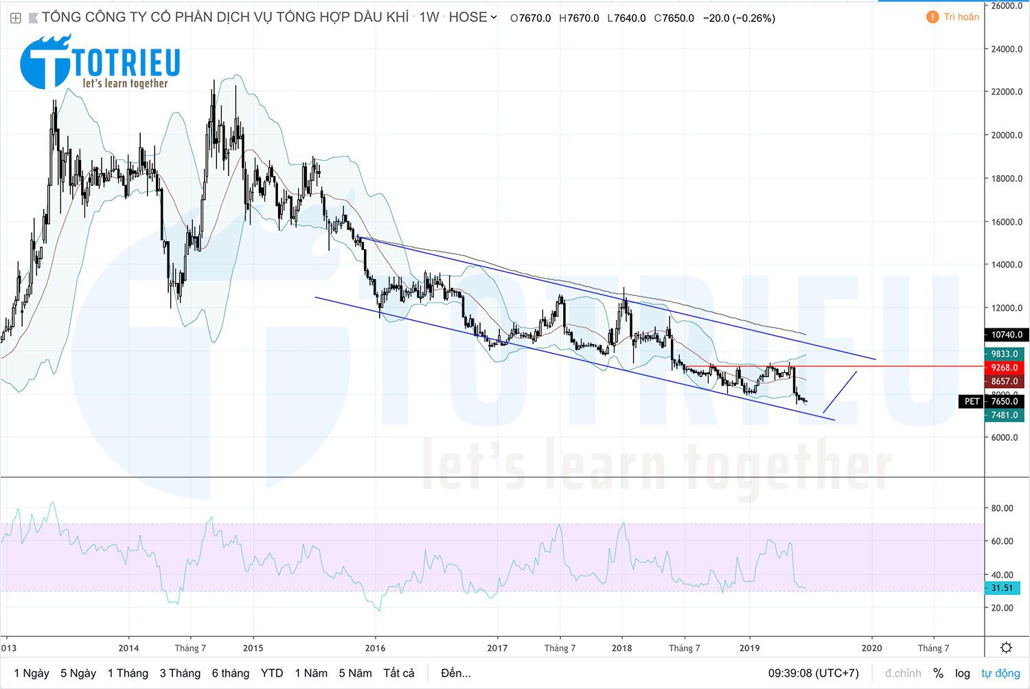 Kênh giá giảm – Descending Channel: PET biến động hoàn toàn trong vùng của kênh giá giảm và kênh giá này cho thấy quá trình bò xuống rất phê pha của PET. Độ dốc không đủ lớn nên rõ ràng PET chưa có sự sụt giảm đáng kể nào. Dấu hiệu của kênh giá cho thấy PET có xu hướng tiếp cận hỗ trợ kênh giá tại 7000 – 7200.