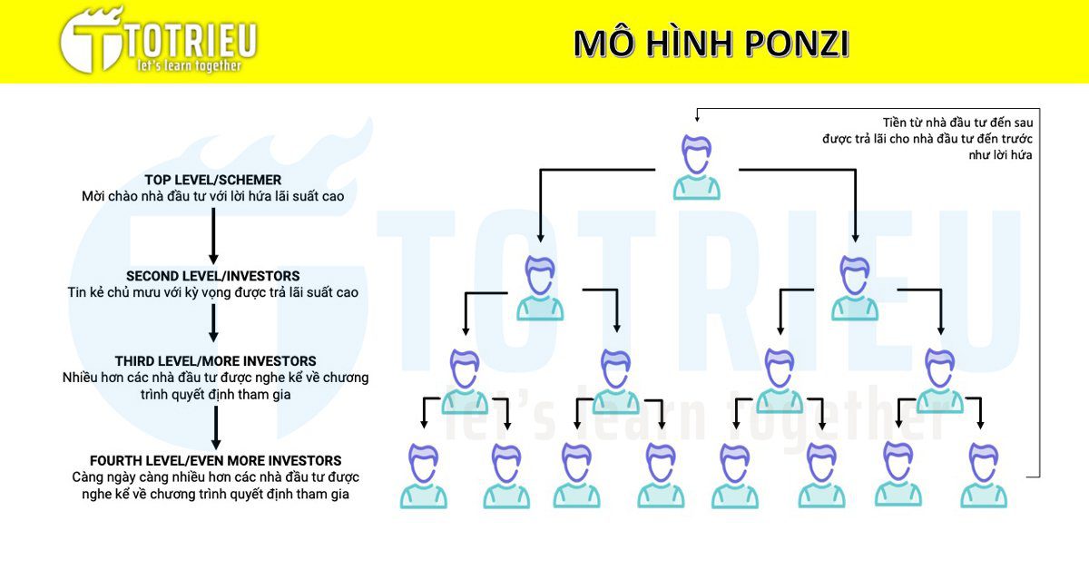 Mô hình Ponzi là hình thức vay tiền của người này để trả nợ người khác. Kẻ đi vay đưa ra cam kết trả lợi tức cao cho người cho vay và quảng cáo với họ về những tấm gương đã từng nhận được lợi tức cao trước đây để hấp dẫn người cho vay. Người cho vay bị hấp dẫn bởi lợi tức cao lại thậm chí giới thiệu những người cho vay mới hơn. Bằng hình thức này, kẻ đi vay càng ngày càng vay được những khoản tiền lớn hơn từ nhiều người cho vay mới hơn.