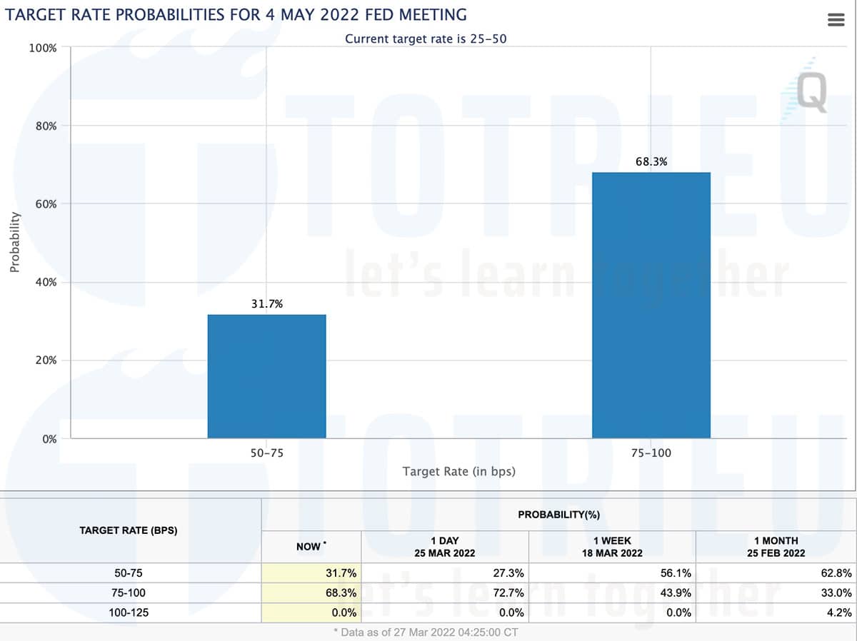 Tháng 04-2022, dự kiến FOMC Meeting Minutes sẽ giúp thị trường tìm kiếm thêm các thông tin về lộ trình tăng lãi suất vào ngày 07/04. Trong tháng 04, giới đầu tư có thể sẽ không có lí do để lo ngại về việc FED tăng lãi suất. Nhưng ngày 04/05/2022, giới đầu tư đang kỳ vọng FED sẽ tăng lãi từ 0.5% – 0.75%
