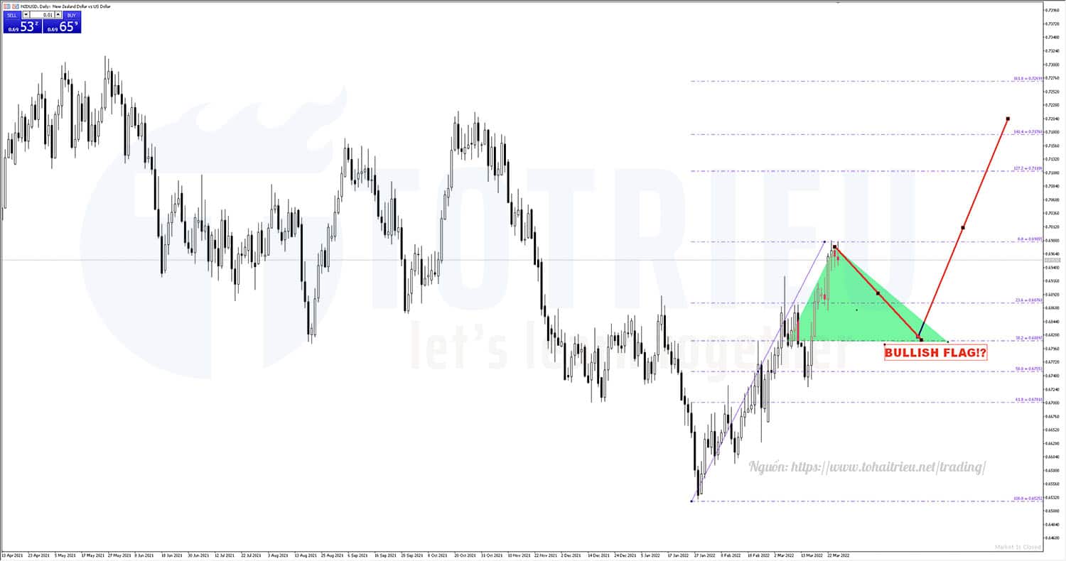 Khi quan sát Fibonacci Retracement, Tôi phát hiện có khả năng nếu Re-test Neckline, thì NZDUSD cũng sẽ đồng thời có tiềm năng hình thành Mô hình Bullish Flag – Cờ tăng vì trước đó là một đợt tăng trưởng rất mạnh.