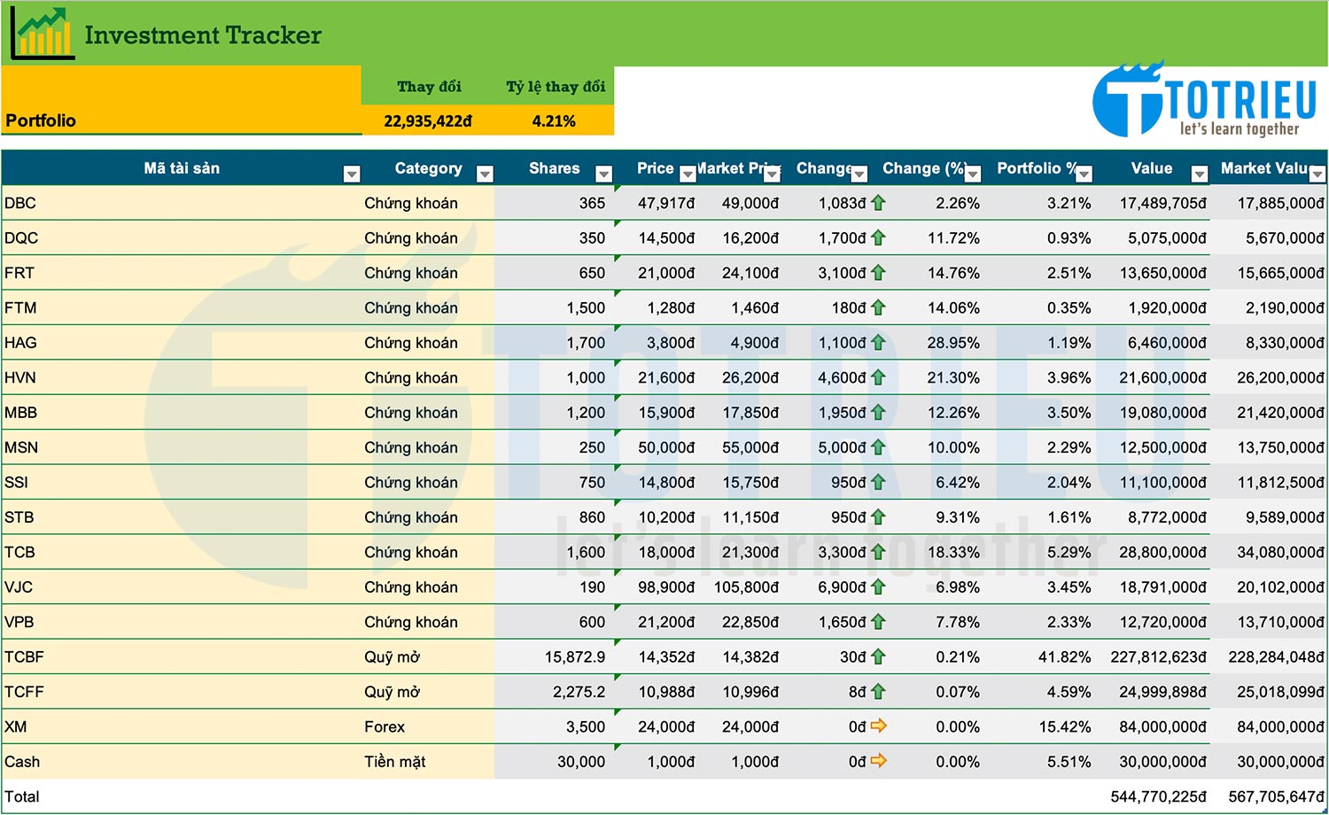 - Portfolio (%): Chiếm tỷ trọng bao nhiêu trong tổng tài sản.