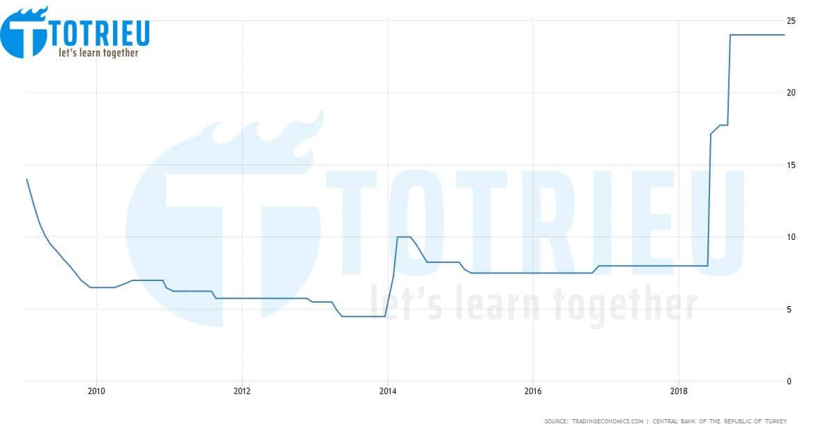 Lãi suất đồng TRY đang ở mức rất cao – 24% thuộc nhóm lãi suất cao nhất từ các quốc gia có nền kinh tế mới nổi với mức độ rủi ro cao. Như vậy nếu lãi suất TRY bị cắt giảm đây có thể sẽ là một chu kỳ cắt giảm lãi suất dài của TRY.