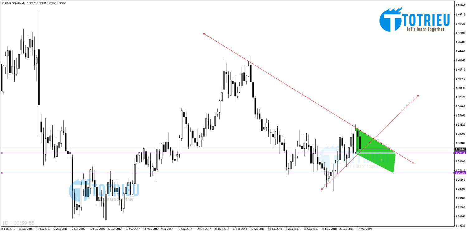 Xu hướng chính: Trên Chart Week 1 của GBP/USD tuần 14/2019 chúng ta có thể nhìn thấy hai xu hướng điển hình khi phân tích kỹ thuật: