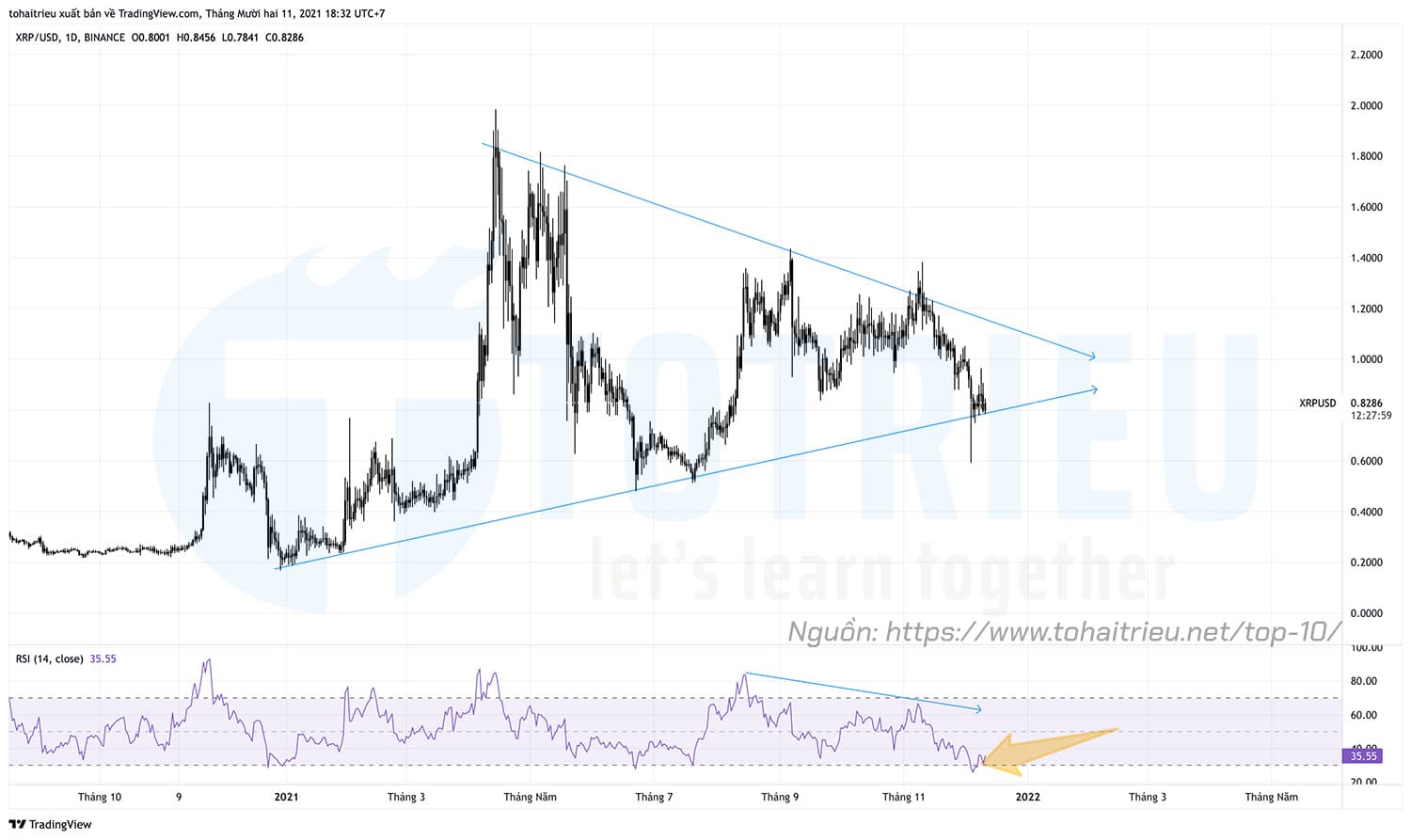 - Mục tiêu nếu đúng: Chờ Breakout vì xác suất breakout cho tam giác cân là 50% – 50% tuy nhiên, XRPUSD có khả năng bounce về kháng cự khi RSI đang Oversold tại hỗ trợ và có Bullish Hammer khá mạnh ở hỗ trợ.