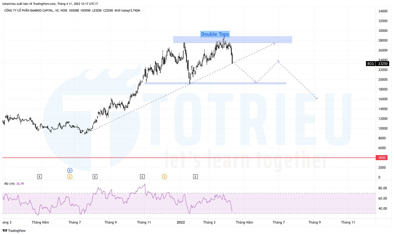 - Mục tiêu nếu đúng: Phá vỡ đường xu hướng tăng và giảm về đáy trung tâm tại 18.000đ/cp. Đề phòng BCG chạy hết biên độ Double Tops thì sẽ giảm sâu về 14.000đ/cp. Tuần tới sẽ có 1 lượng bắt đáy nhẹ BCG khi RSI Oversold tại 22.000đ. Nhưng đó là vùng mua cực kỳ mạo hiểm khi Thị trường chứng khoán đang chịu nhiều tin tức cơ bản tiêu cực và tâm lý bán tháo đang lan rộng.