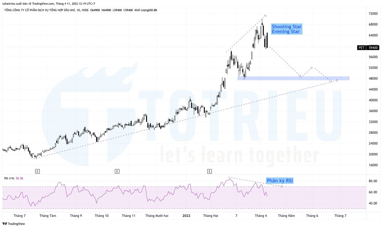 - Vùng giá quan trọng: Kháng cự tại 68.00đ – 70.000đ/cp. Đề phòng phân kỳ RSI giảm sẽ tạo thêm áp lực bán tháo cho PET.