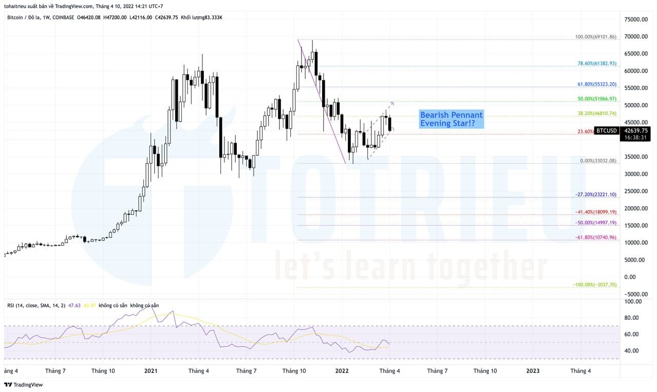 - Mô hình xuất hiện: Evening Star tại Fibo 38.2% tiềm năng tạo Cờ giảm – Bearish Pennant