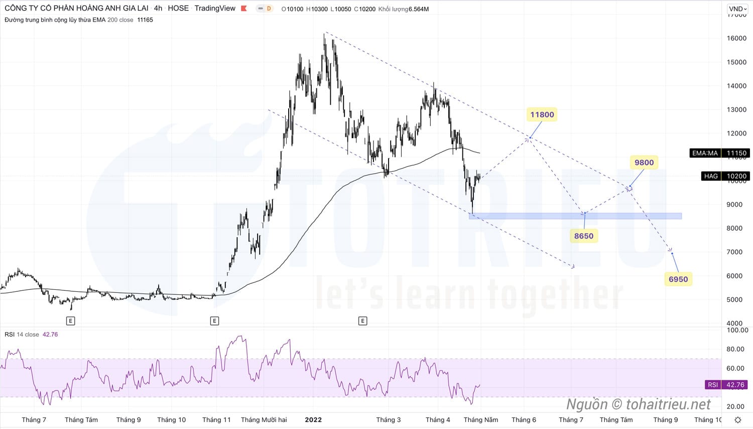 - Vùng giá quan trọng: Kháng cự tại 11800đ/cp đồng thời là EMA200. Hỗ trợ tại 8500đ/cp là vùng có thể tạo 2 đáy tạm thời. Hỗ trợ tiếp theo tại 6950đ/cp là vùng mà từ đó HAG có đợt tăng bứt phá lên 16.000đ/cp.