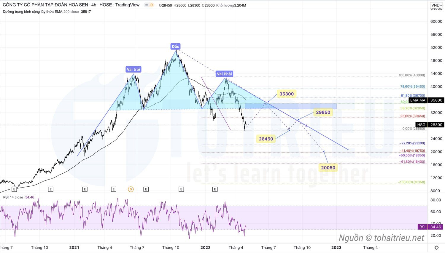 - Vùng giá quan trọng: Kháng cự ở Fibo 50% tại 35.300đ/cp. Hỗ trợ tại 26.400đ/cp và sâu hơn là 20.000đ/cp
