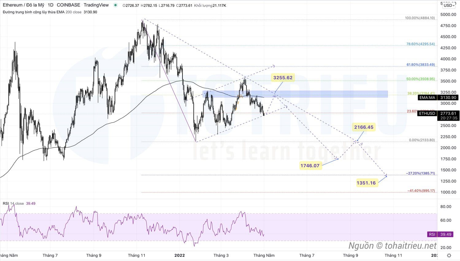 - Vùng giá quan trọng: Kháng cự tại $3250 đồng thời là EMA200 D1, vùng có thể tạo Vai phải của Vai – Đầu – vai thuận. Hỗ trợ tại $2150 – Vùng hai đáy và $1740 – Hỗ trợ ngang dài hạn; $1352 – Vùng Fibo mở rộng của đợt giảm mạnh trước đó.