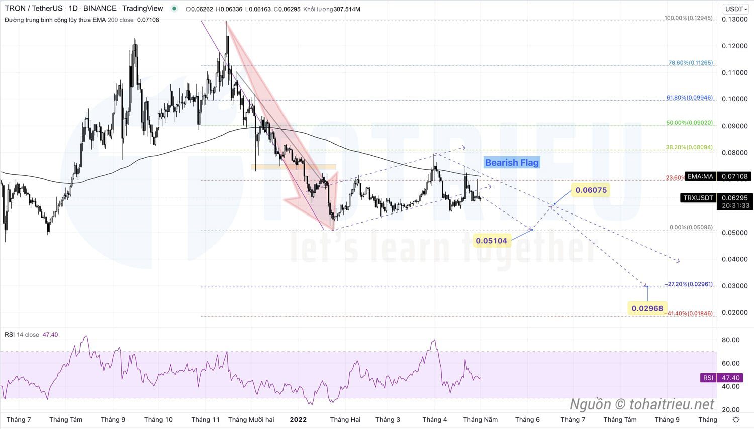 - Vùng giá quan trọng: Kháng cự flag đồng thời là EMA200 đã tạo mô hình 2 đỉnh – 0.0700. Hiện tại TRXUSDT đã Breakout Flag. Hỗ trợ tại 0.05 và 0.02