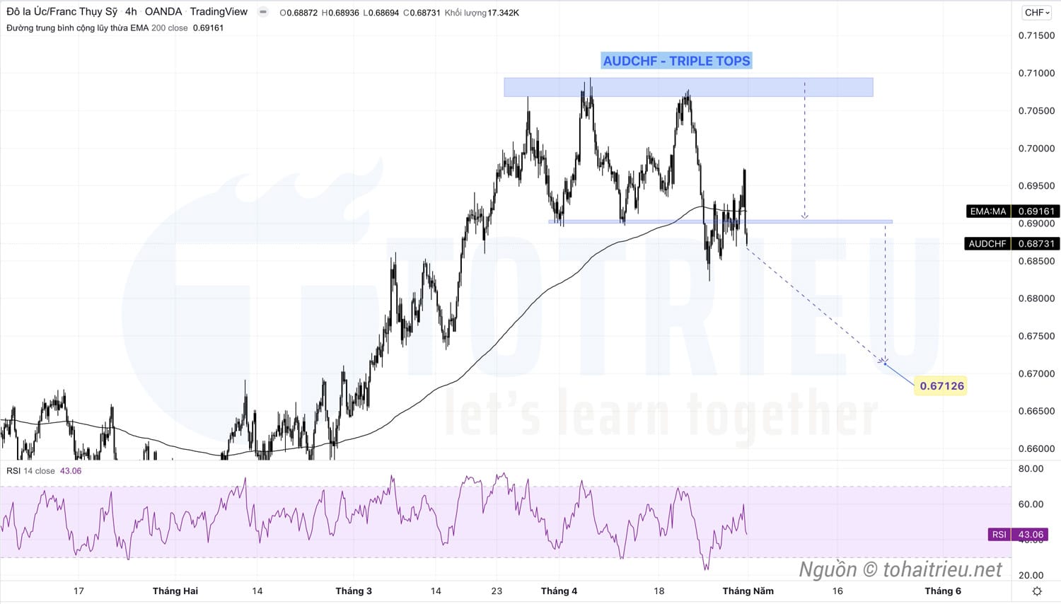 - Mục tiêu nếu đúng: Kiểm tra lại Kháng cự 0.6950 sau đó sụt giảm hết biên độ Triple Tops tại 0.6700