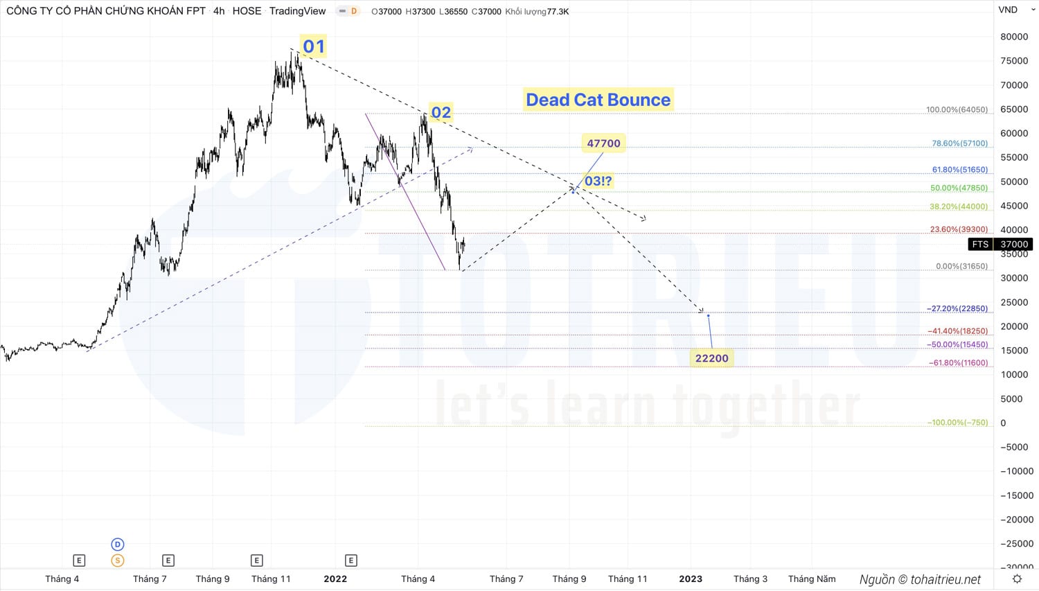 - Mục tiêu nếu đúng: Có đợt phục hồi kỹ thuật về vùng bounce 47.000đ – 51.000đ sau đó tiếp diễn xu hướng giảm về 30.000đ và 22.800đ. Đề phòng tháng 05-2023 FTS sẽ ở giá 22.800đ.