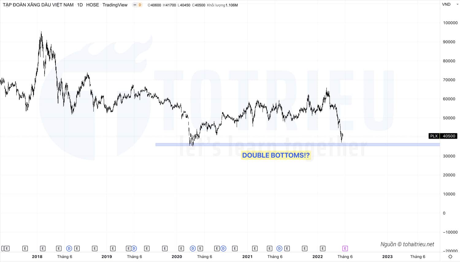 - Mục tiêu nếu đúng: Giảm về vùng 2 đáy tại 34.000đ – 36.000đ sau đó phục hồi về 45.000đ, 50.000đ và đỉnh trung tâm tại 60.000đ. Biên độ của Mô hình 2 đáy trên cổ phiếu PLX là 84.000đ.