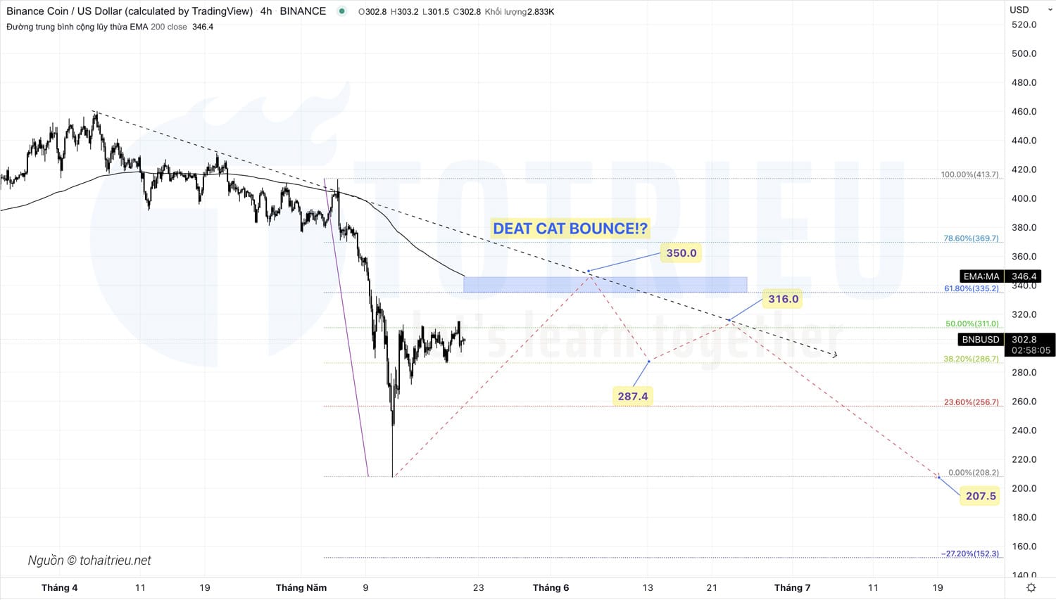 - Vùng giá quan trọng: Kháng cự tại $350 là đường Down Trendline, EMA200 và Fibonacci 61.8%. Hỗ trợ tại $300, $279, $250, $200