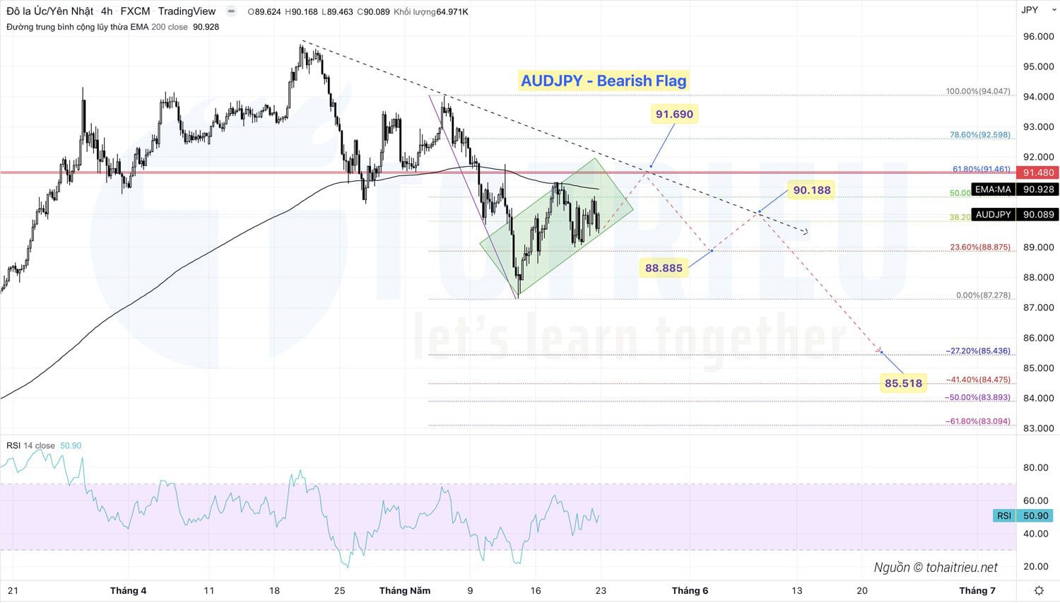 - Mục tiêu nếu đúng: Phục hồi về 91.69 sau đó sụt giảm về 88.89 xác nhận đường Xu hướng giảm trên khung 4 giờ. Đường xu hướng giảm này sẽ tiếp tục là kháng cự để đẩy AUDJPY giảm về 85.69.