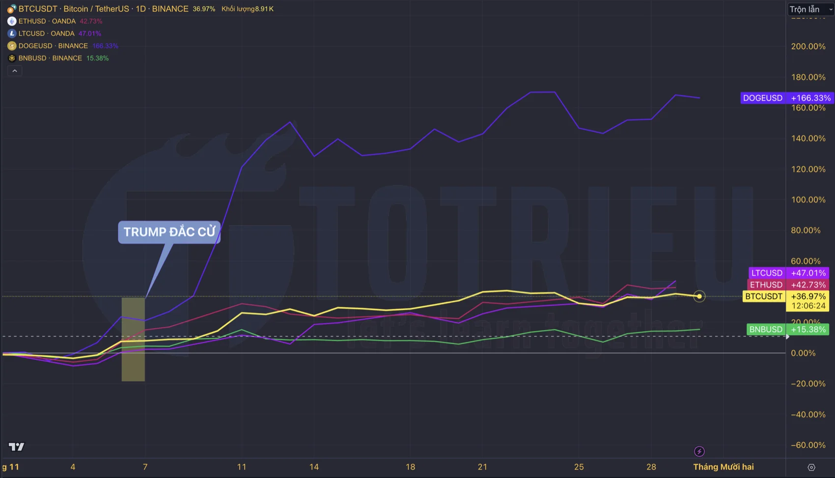 Hưởng lợi nhiều nhất sau bầu cử tại Hoa Kỳ là DOGECOIN, một Uỷ ban hiệu quả Chính phủ, theo một cách nào đó được viết tắt là DOGE cũng là loại tiền mã hoá được Elon Musk đề cập nhiều lần trong giai đoạn 2021 – 2022. Kết quả là DOGECOIN đã tăng 166,33% tiến tới ngưỡng $0,5