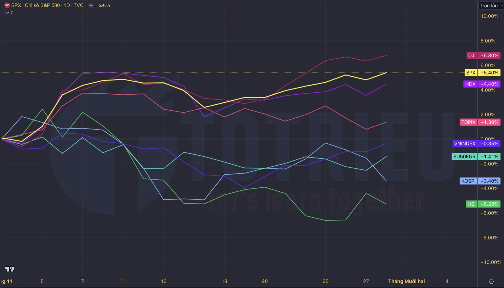 Thị trường chứng khoán toàn cầu tháng 11/2024 cũng buồn như với thị trường tiền tệ. Dòng vốn chảy mạnh vào thị trường Hoa Kỳ giúp thị trường chứng khoán Hoa Kỳ thăng hoa và liên tục Phá đỉnh lịch sử.