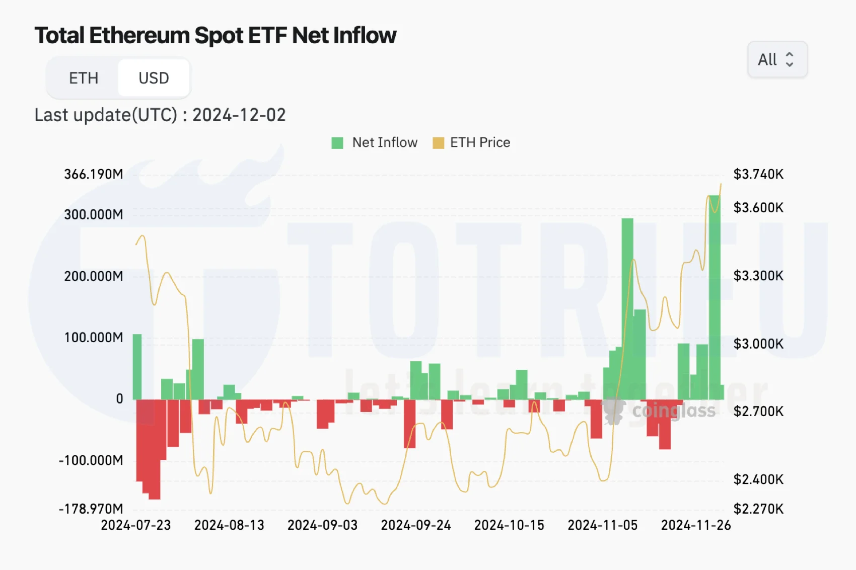 Điều đặc biệt là khi thị trường tiền mã hoá bùng nổ, liên tục tạo ATH thì ETHUSD lại chưa hề quay về mức ATH của hai năm trước đây. Hiện tại dòng vốn vào các quỹ ETH ETFs cũng đang có dấu hiệu bùng nổ có khả năng sẽ là động lực chính để Ethereum giữ giá và hướng tới ATH trong tháng 12: