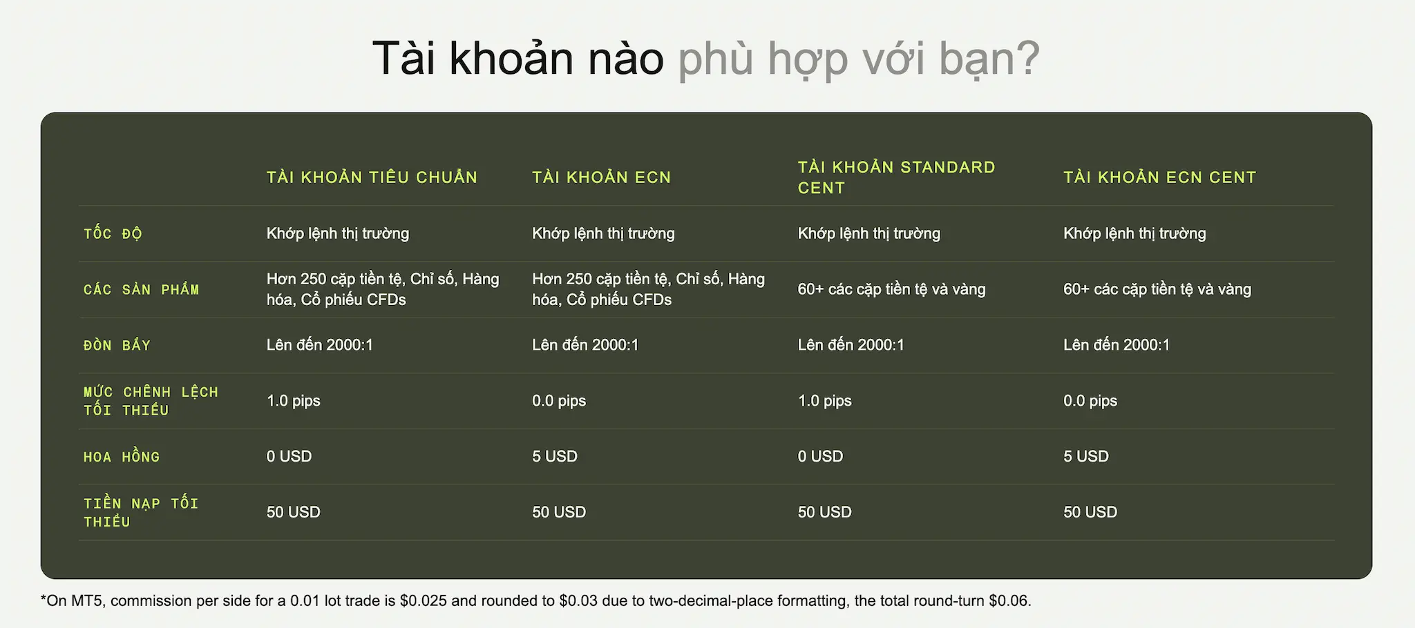 ECN Account dành cho trader chuyên nghiệp muốn truy cập trực tiếp vào thị trường liên ngân hàng với spread thấp nhất và tốc độ khớp lệnh nhanh.