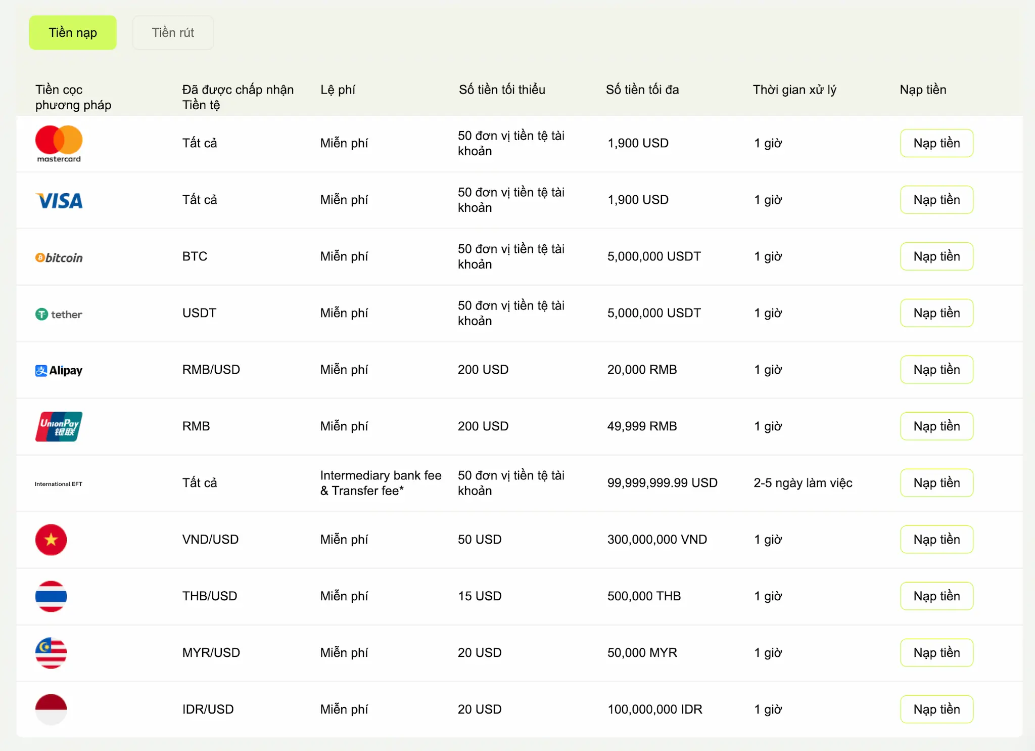 Ultima Market hỗ trợ đa dạng các hình thức nạp rút qua thẻ tín dụng, tiền mã hóa và Ngân hàng nội địa: