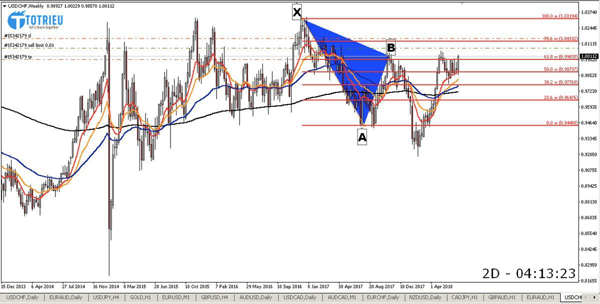 Cạnh AB: Ngay khi tạo XA, Tỷ giá chạm vùng Fibo 61.8% của cạnh XA thì quay đầu. Ngay tại vị trí quay đầu ở mức Fibo 61.8% tạo thành điểm B (1.0015) tại Tuần thứ 44 năm 2017 (Tuần cuối tháng 10 năm 2017).