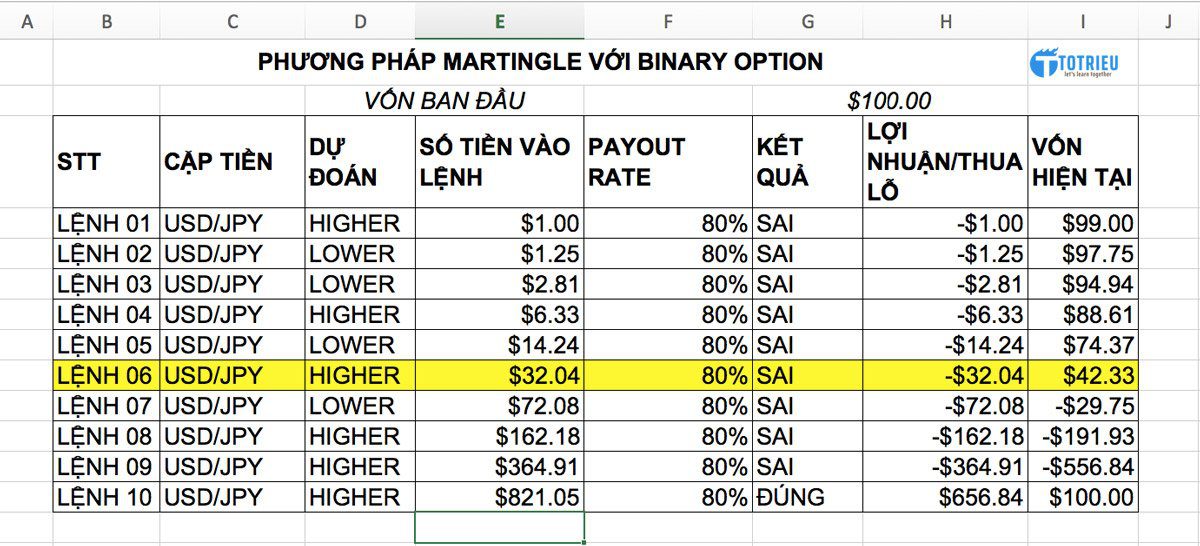 Với hình ảnh phía trên, Vốn 1$ và nếu theo Martingle chỉ cần tới lệnh thứ 7 là bạn đã tèo hết vốn rồi. Hay để cứu 1$ bạn đã phải dùng toàn bộ tài khoản 99$ còn lại một cách mù quáng.
