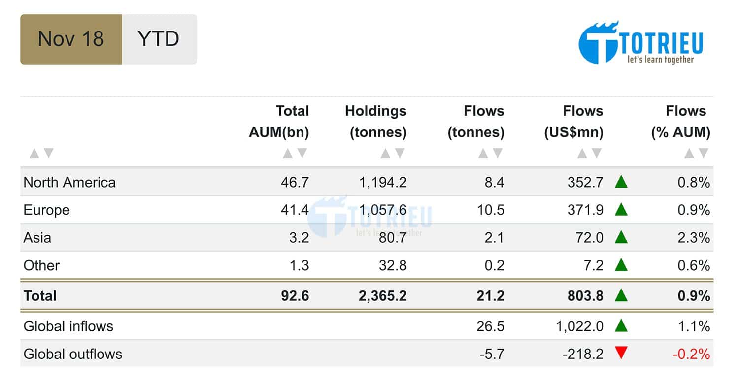 Trong tháng 11 năm 2018, Tổng lượng Vàng được nắm giữ theo khu vực đã tăng thêm 21.2 tấn đẩy con số tổng toàn cầu lên 2365.2 tấn.