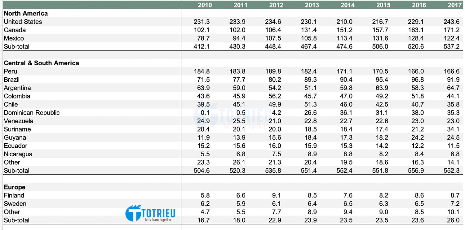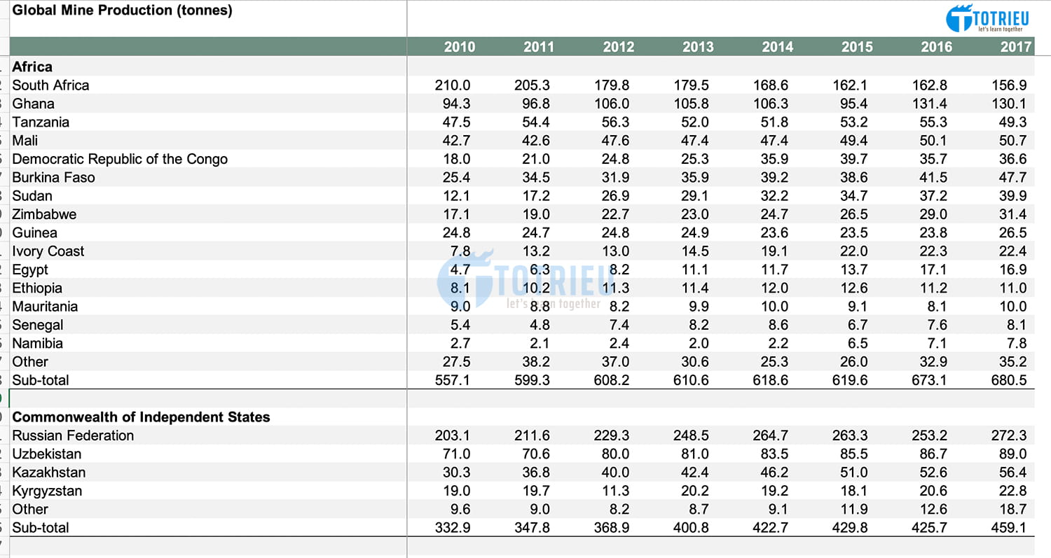 Để theo dõi sâu và kỹ hơn về Sản lượng vàng toàn cầu, chúng ta sẽ cùng xem xét và đánh giá Sản lượng Khai thác vàng của Từng quốc gia theo từng khu vực trên toàn cầu tính từ năm 2010 tới năm 2017 như sau: