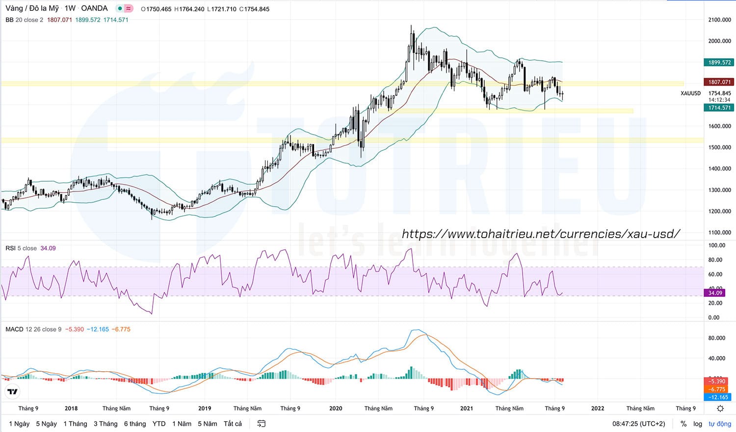 - Bandwidth tương đối rộng cho thấy biên độ Sideway biên độ rộng từ $1700/oz – $1900/oz.